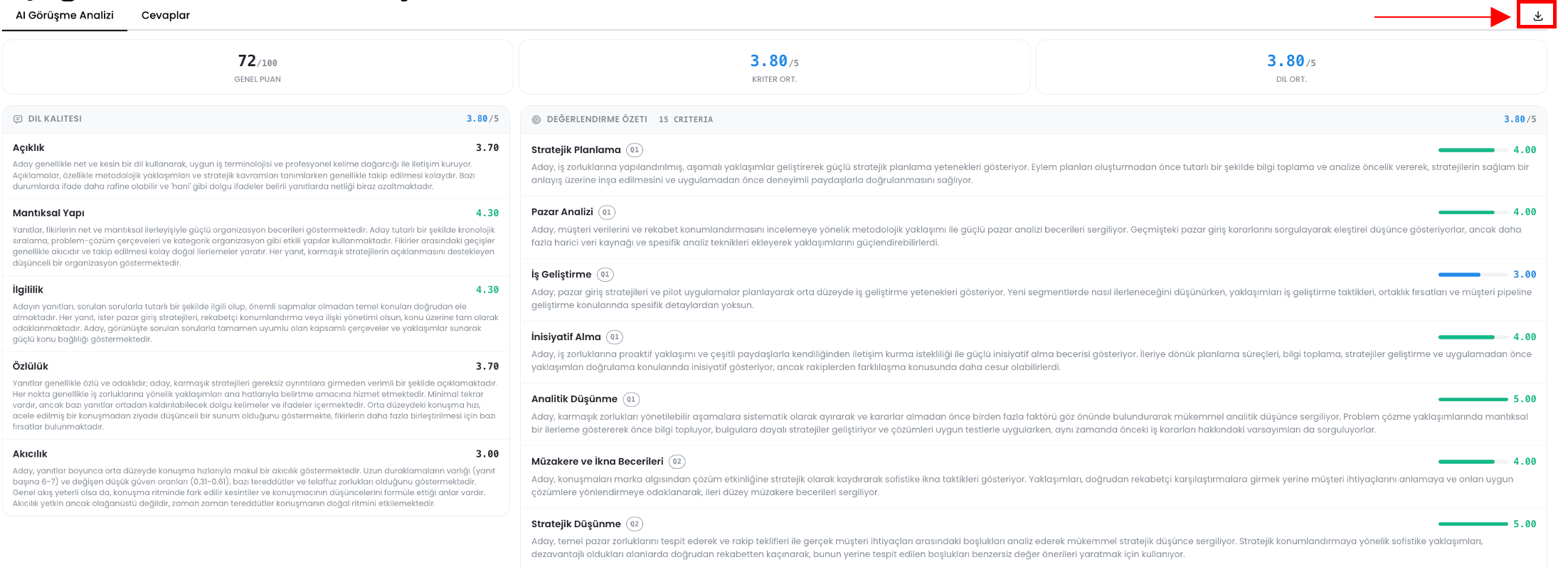 - Kırmızı ile işaretlenen alandan AI Video Mülakat raporunu pdf olarak indirebilirsiniz.