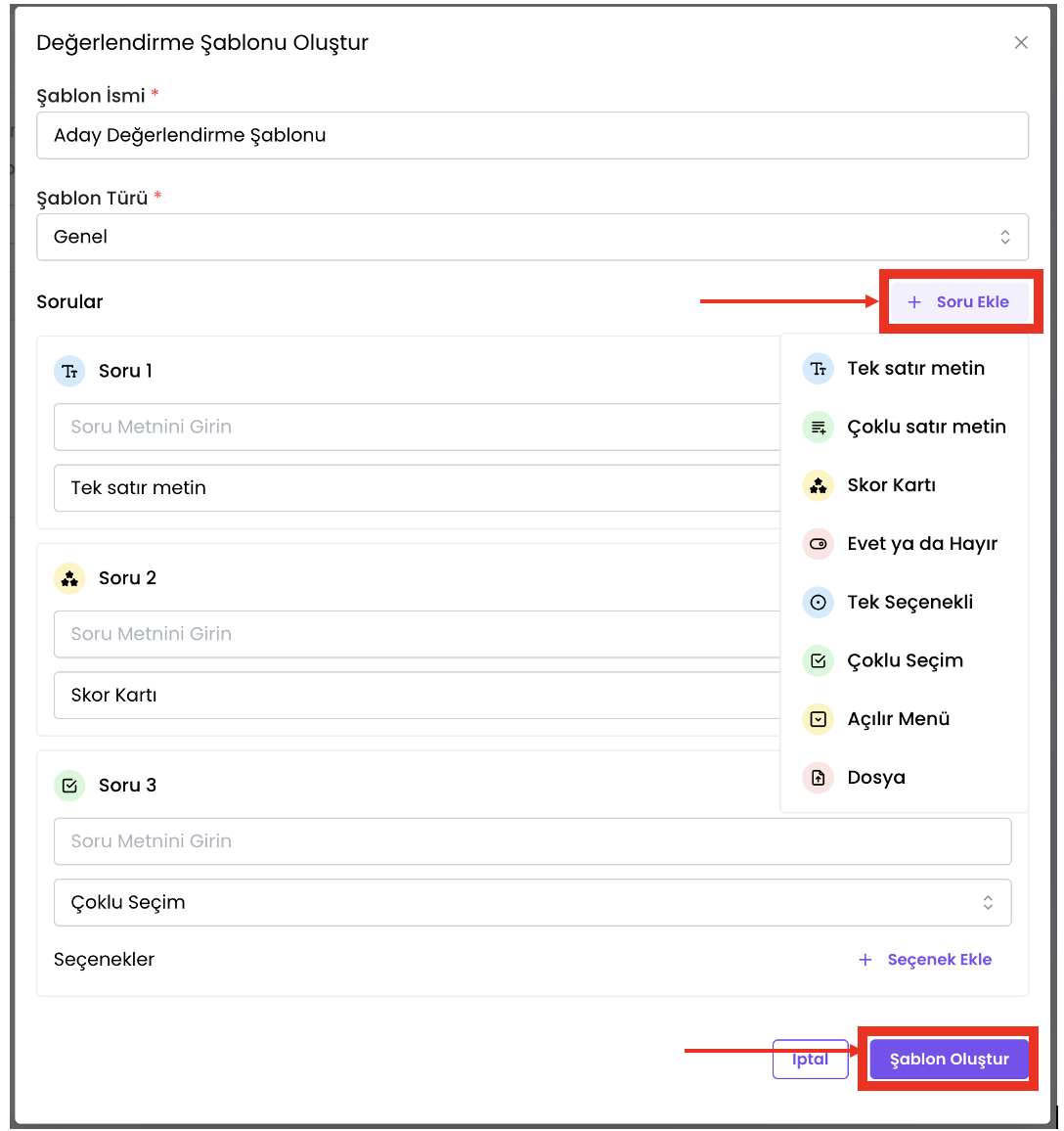 - Değerlendirme için sorularınızı ekleyin.
